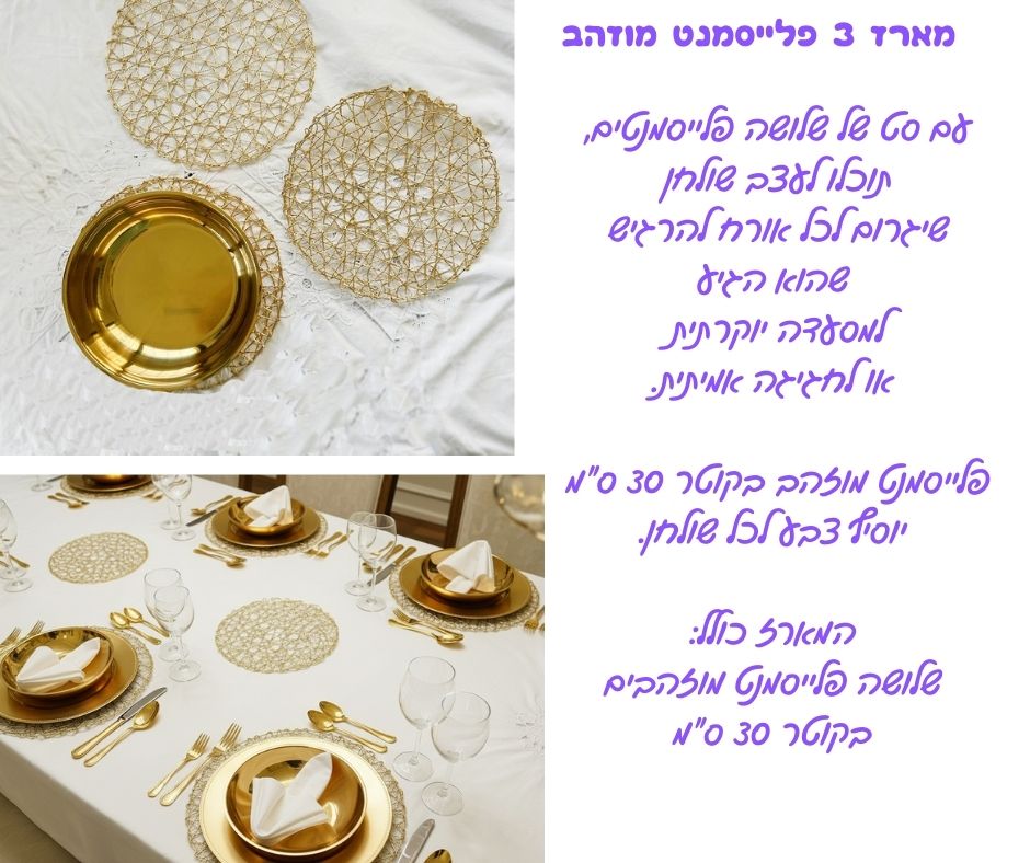 המארז מכיל 3 פלייסמנטים מוזהבים בקוטר 30 ס”מ