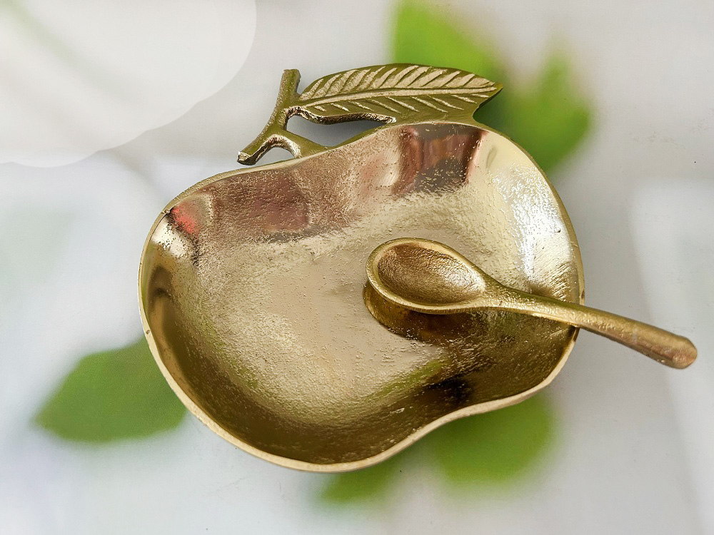 קערית הגשה מוזהבת בצורת חצי תפוח מגיעה עם כפית מוזהבת, המשלימה את הסט באופן מושלם.